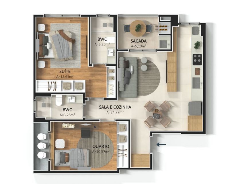 Apartamento de 2 dormitórios, sendo um suíte, 1 banheiro social, cozinha, área de serviço, sala de estar e jantar, sacada com churrasqueira.